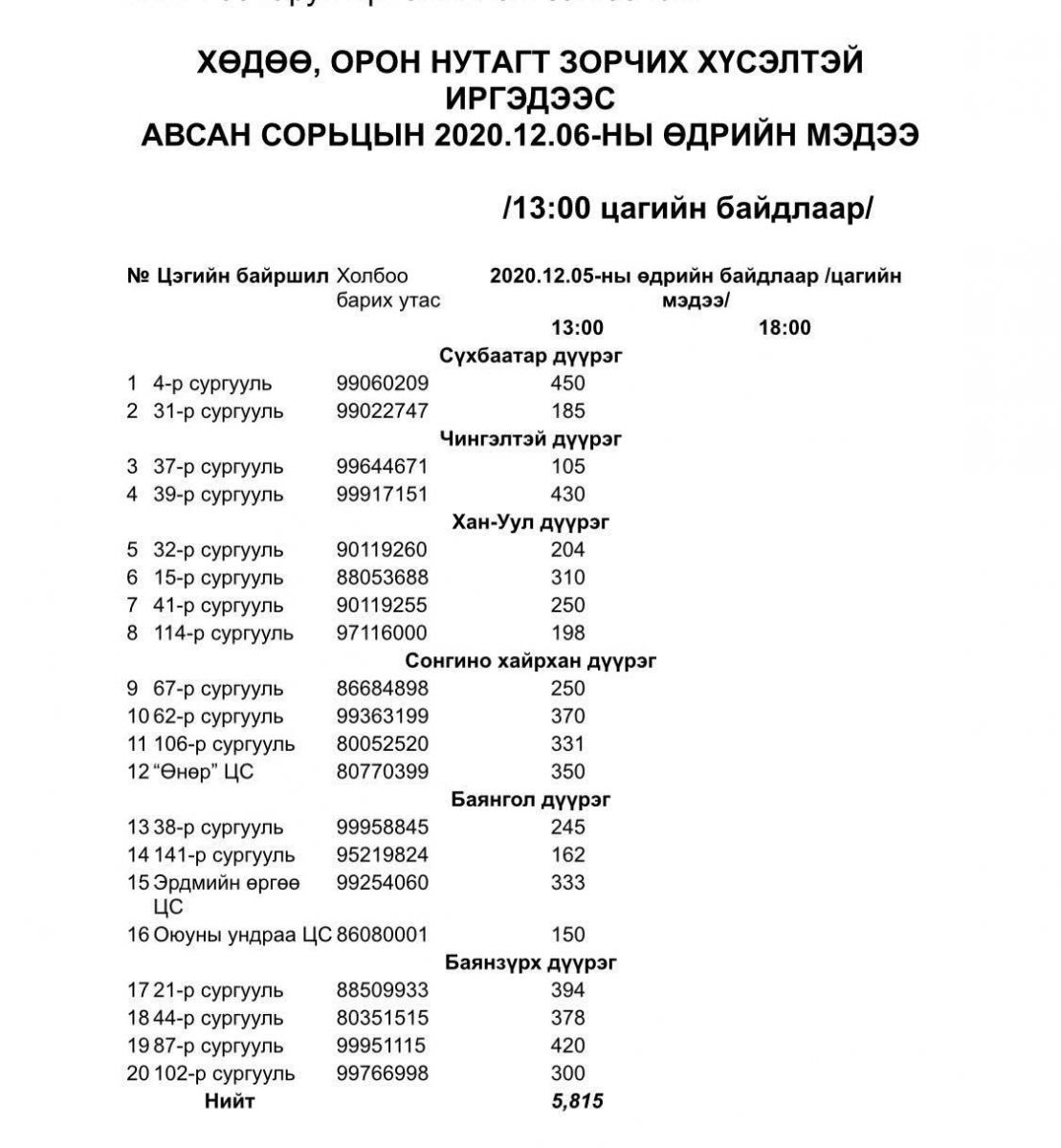 2020.12.05-ны өдөр 8,347 иргэн шинжилгээ өгсний 1,755 нь оюутан юм. Мөн 21, 44-р сургуульд “өрх бүрээс нэг иргэн” бодлогын хүрээнд 892 хүнээс шинжилгээ авчээ.
