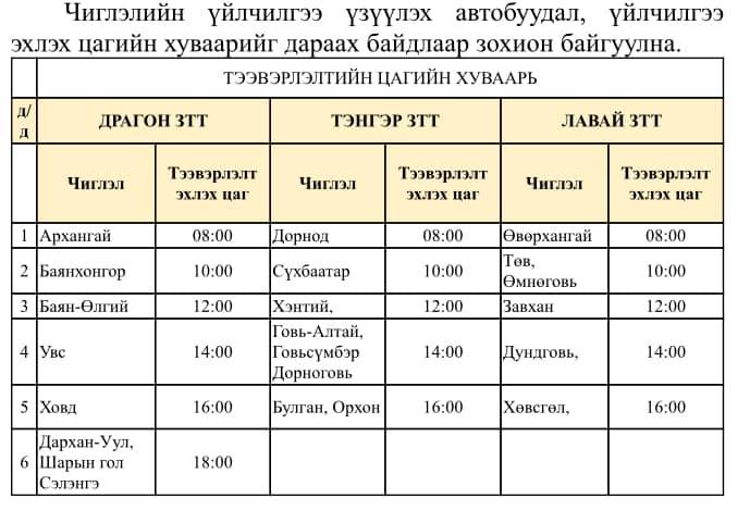 Чиглэлийн үйлчилгээ үзүүлэх автобуудал, үйлчилгээ эхлэх цагийн хуваарийг дараах байдлаар зохион байгуулна.