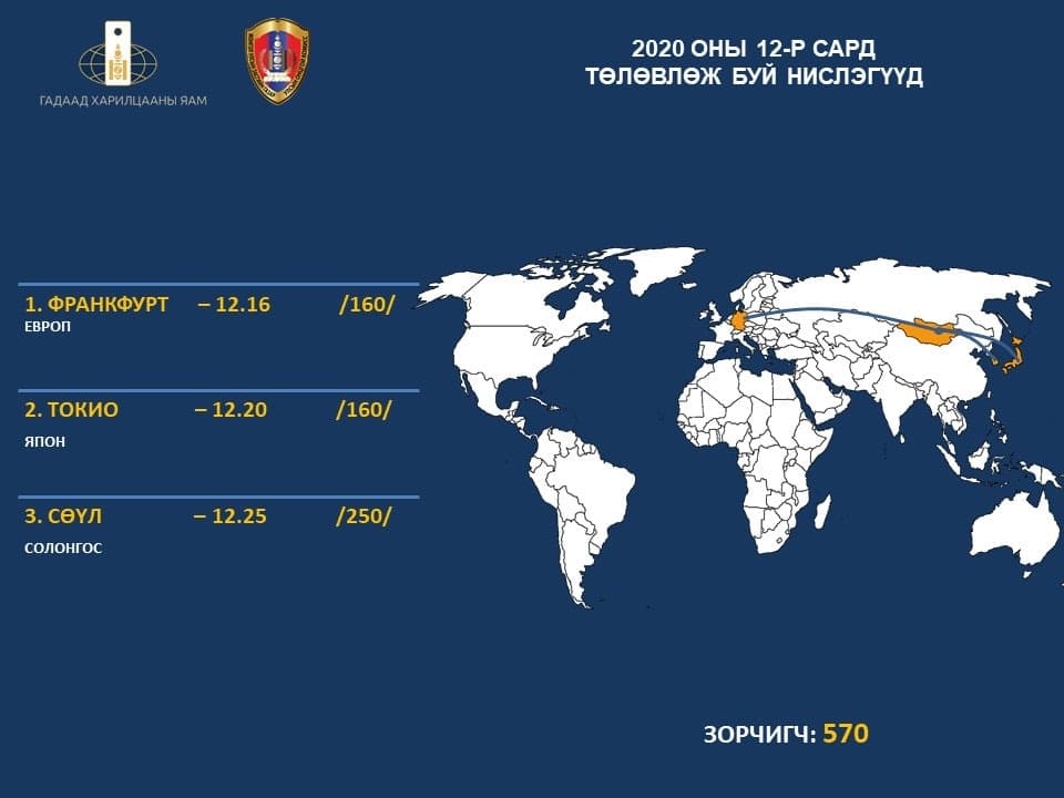 12 дугаар сарын 25-нд УБ-Сөүл чиглэлд тусгай үүргийн нислэг үйлдэнэ.