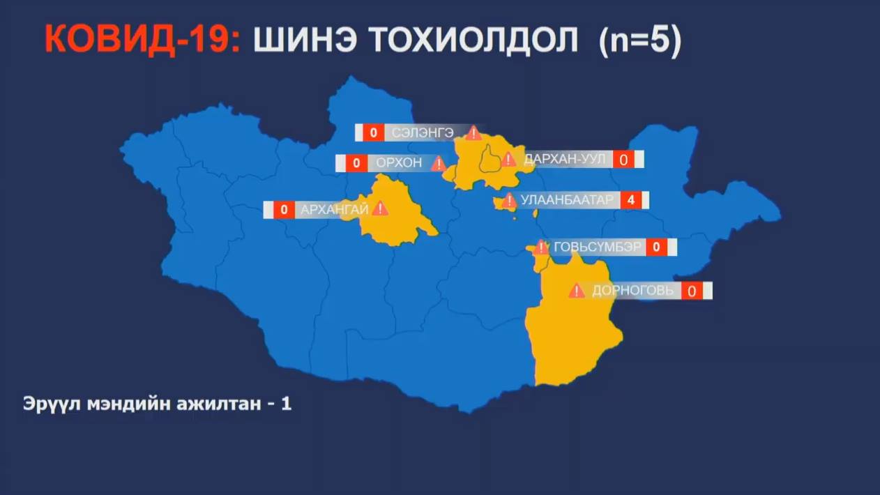 Сүүлийн 24 цагийн хугацаанд Сэлэнгэ, Дархан-Уул, Орхон, Дорноговь, Говьсүмбэр, Архангай аймагт сүүлийн 24 цагт халдвар нэмж бүртгэгдээгүй ба өнөөдрийн байдлаар дотоодын халдварын нийт тоо 447 боллоо.