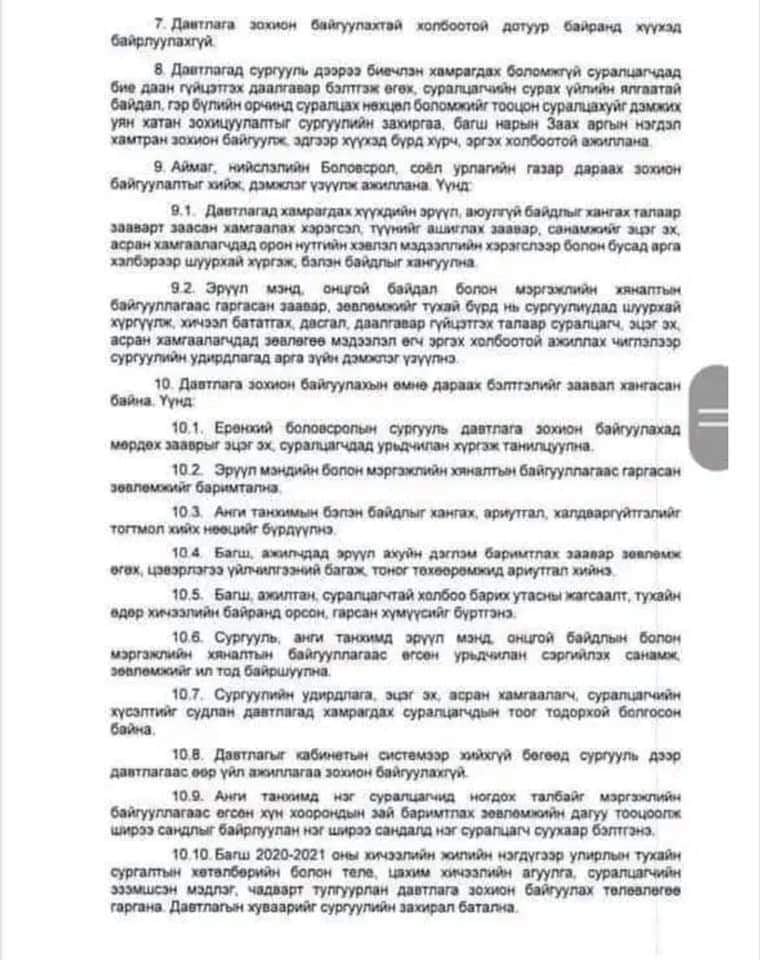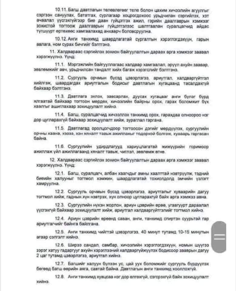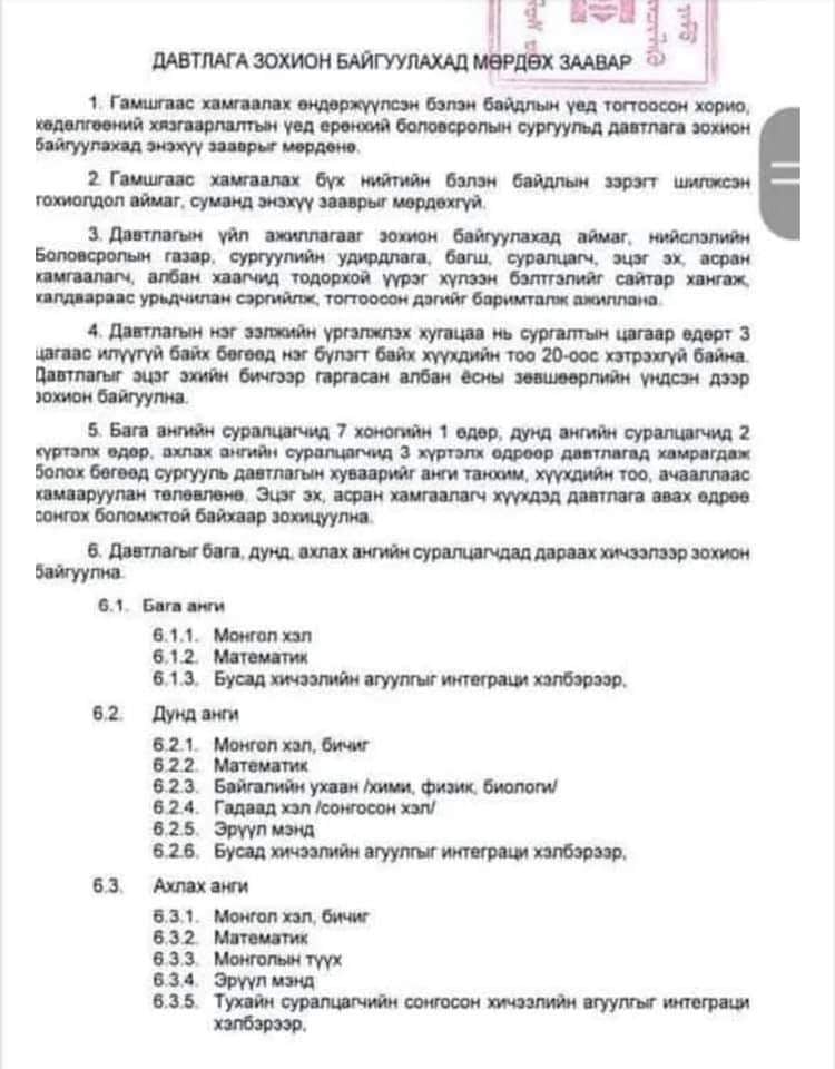 Боловсрол, шинжлэх ухааны сайдын 2020 оны арванхоёрдугаар сарын 11-ний өдрийн А/180 дугаар “Заавар батлах тухай” тушаалаар Ерөнхий боловсролын сургуулийн суралцагчдад 2020-2021 оны хичээлийн жилийн нэгдүгээр улирлын теле, цахим хичээлийг бататгах, суралцагчдын сурах үйлийг дэмжих зорилготой давтлагыг сургуулийн орчинд 2020 оны арванхоёрдугаар сарын 15-ны өдрөөс эхлэн зохион байгуулахыг зөвшөөрлөө.
