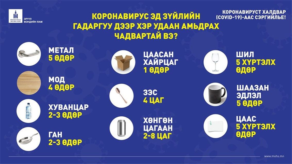 -Коронавирус илрүүлэх судалгааг бид гурван чиглэлээр хийж байгаа. Нэгдүгээрт, тохиолдолд суурилсан, хоёрдугаарт, эмнэлгийн байгууллагад, гуравдугаарт, лабораторид суурилан хийж байна. Коронавирус гадаргуу дээр хэр удаан тогтдог талаар иргэд их асууж байна. Үүнд хариулт өгье.