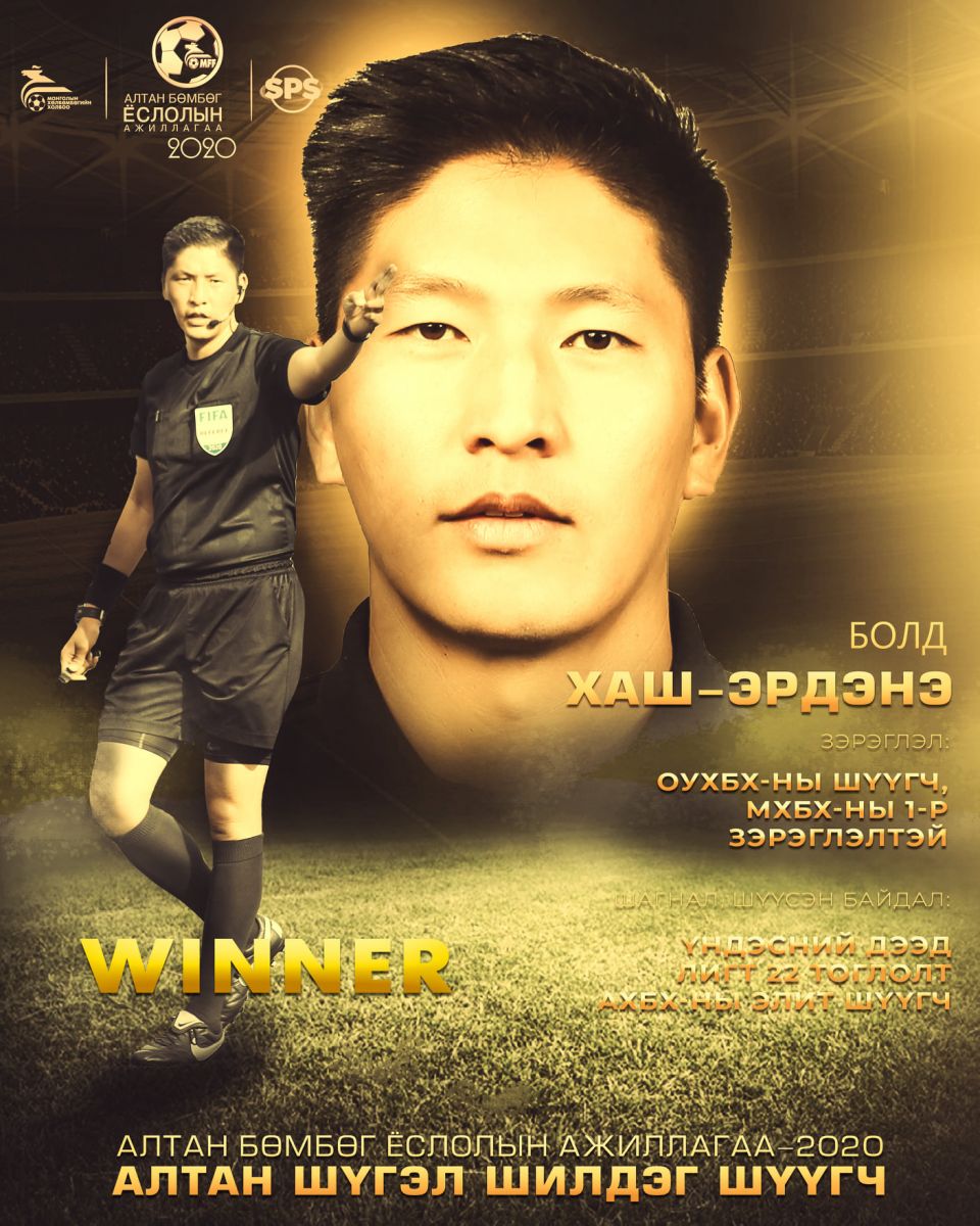 МХБХ-ны оны шилдгүүдийг тодруулах “Алтан бөмбөг 2020” Виртуал ёслолын ажиллагааны “Алтан шүгэл” номинацийн эзнээр ОУХБХ-ны шүүгч, АХБХ-ны Элит шүүгч Б.Хаш-Эрдэнэ тодорлоо.