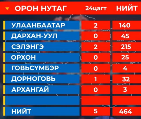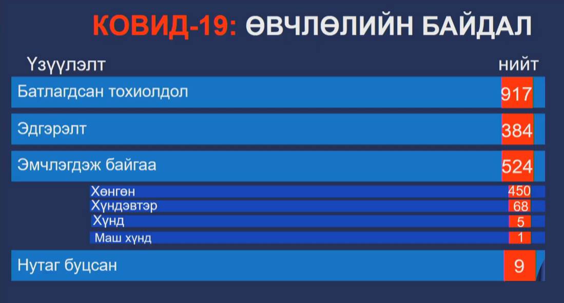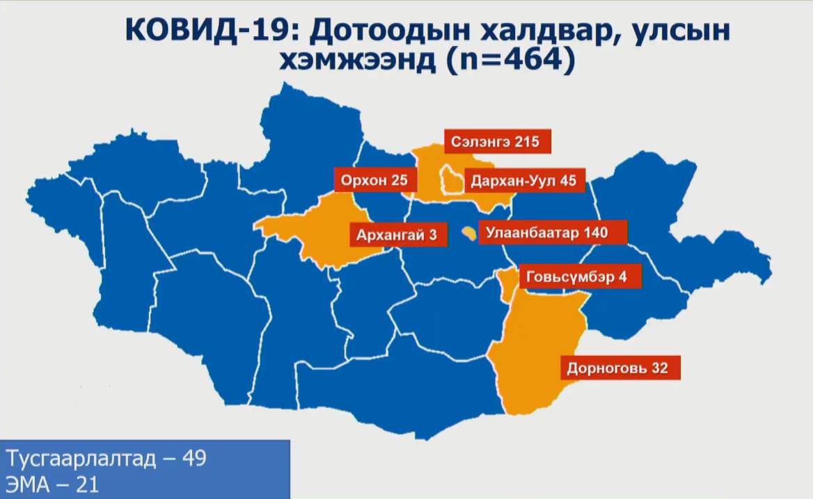 Сүүлийн 24 цагийн хугацаанд коронавирусний халдвартай хүн Улаанбаатарт 2, Сэлэнгэ аймагт 2, Дорноговь аймагт 1 нэмж бүртгэгдлээ.