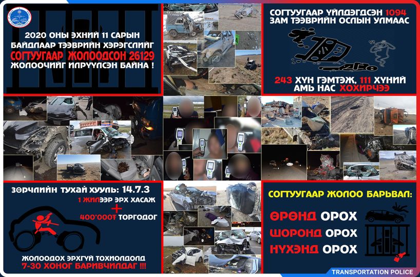 Үүнээс согтуугаар үйлдэгдсэн 1094 зам тээврийн ослын улмаас 243 хүн гэмтэж, 111 хүн нас барсан байна.