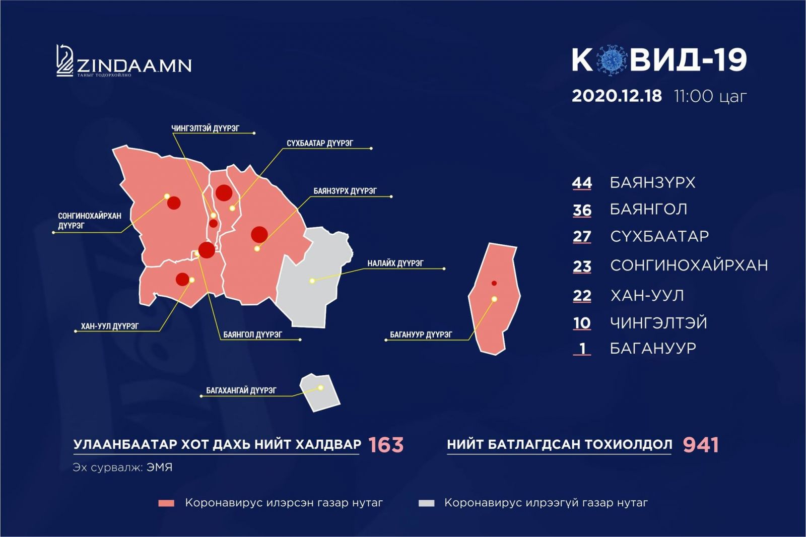 Сүүлийн 24 цагт нийт 9070 шинжилгээ хийхэд 18 хүнээс коронавирус илэрлээ. Бүх тохиолдол Улаанбаатарын Баянзүрх дүүргийн нэгдсэн эмнэлгээс илэрчээ. Хавьтлын 645 хүнийг тусгаарлаж, 415 хүнийг гэрт нь ажиглалтад байлгаж байна.