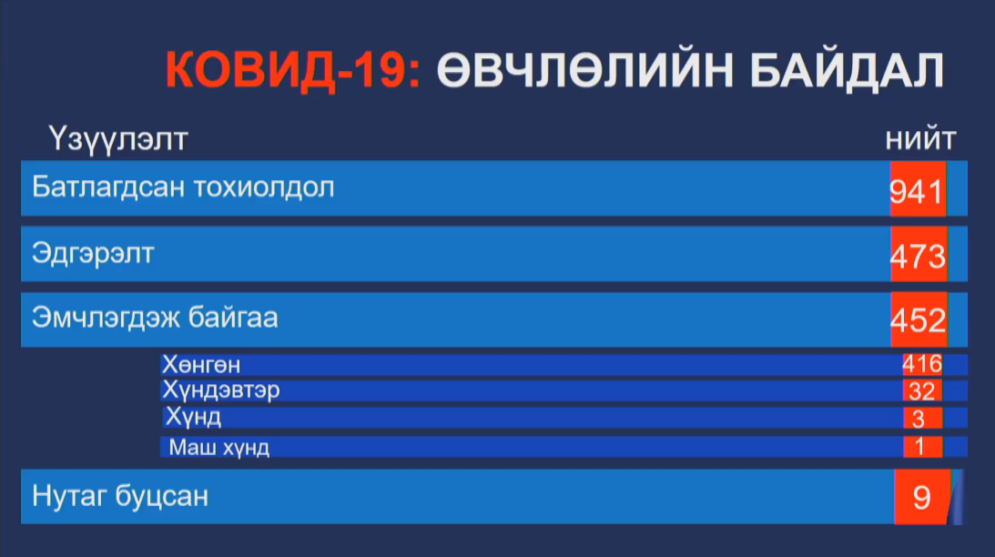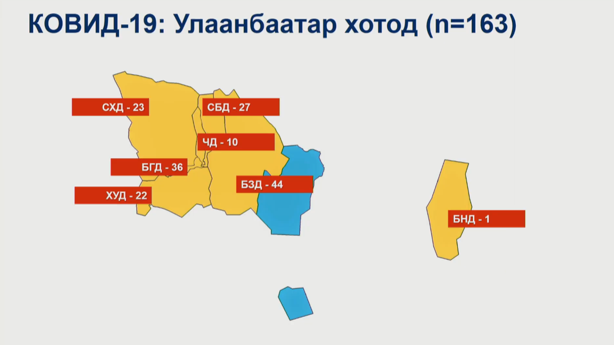 Халдварын батлагдсан 20 тохиолдлуудын хавьтал болох 645 хүнийг олж тогтоосон. 266 хүнийг тусгаарлан ажиглах байранд тусгаарласан. 369 хүнийг гэрийн ажиглалтад байлгаж байна. Эхний 469 хүнд хийсэн хавьтлын шинжилгээгээр халдвар илрээгүй. Баянзүрх дүүргийн нэгдсэн эмнэлэгт эмч, ажилчид, өвчтөнүүд, сахиур гээд нийт 379 хүний тусгаарлан, ажиглаж байна.