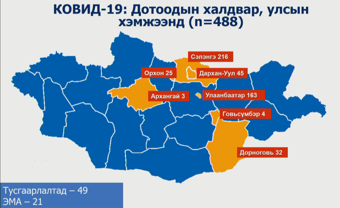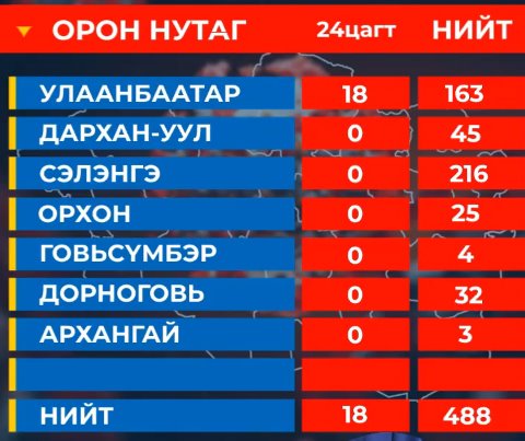 Сүүлийн 24 цагийн нэгтгэсэн мэдээллээр Монголд бүртгэгдсэн халдварын тоо 941 боллоо. Үүний 488 нь дотоодод бүртгэгдсэн халдвар болоод байна.