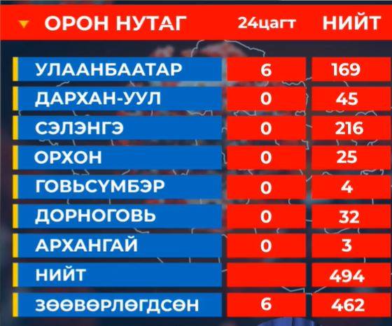 Өнгөрсөн 24 цагийн хугацаанд Сэлэнгэ, Дархан-Уул, Орхон, Дорноговь, Говьсүмбэр, Архангай аймагт халдвар нэмж бүртгэгдээгүй байна.
