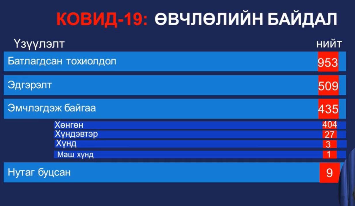Өнөөдөр ХӨСҮТ-д хэвтэн эмчлүүлж байсан 36 хүн эдгэрч, Яармагийн эмнэлэг рүү ажиглалтад шилжжээ. Одоогоор ХӨСҮТ, Цэргийн төв эмнэлэг, Хан-Уул дүүргийн 300 ортой эмнэлэг болон Сэлэнгэ аймагт гээд улсын хэмжээнд нийт 435 батлагдсан тохиолдол эмчлүүлж байна.