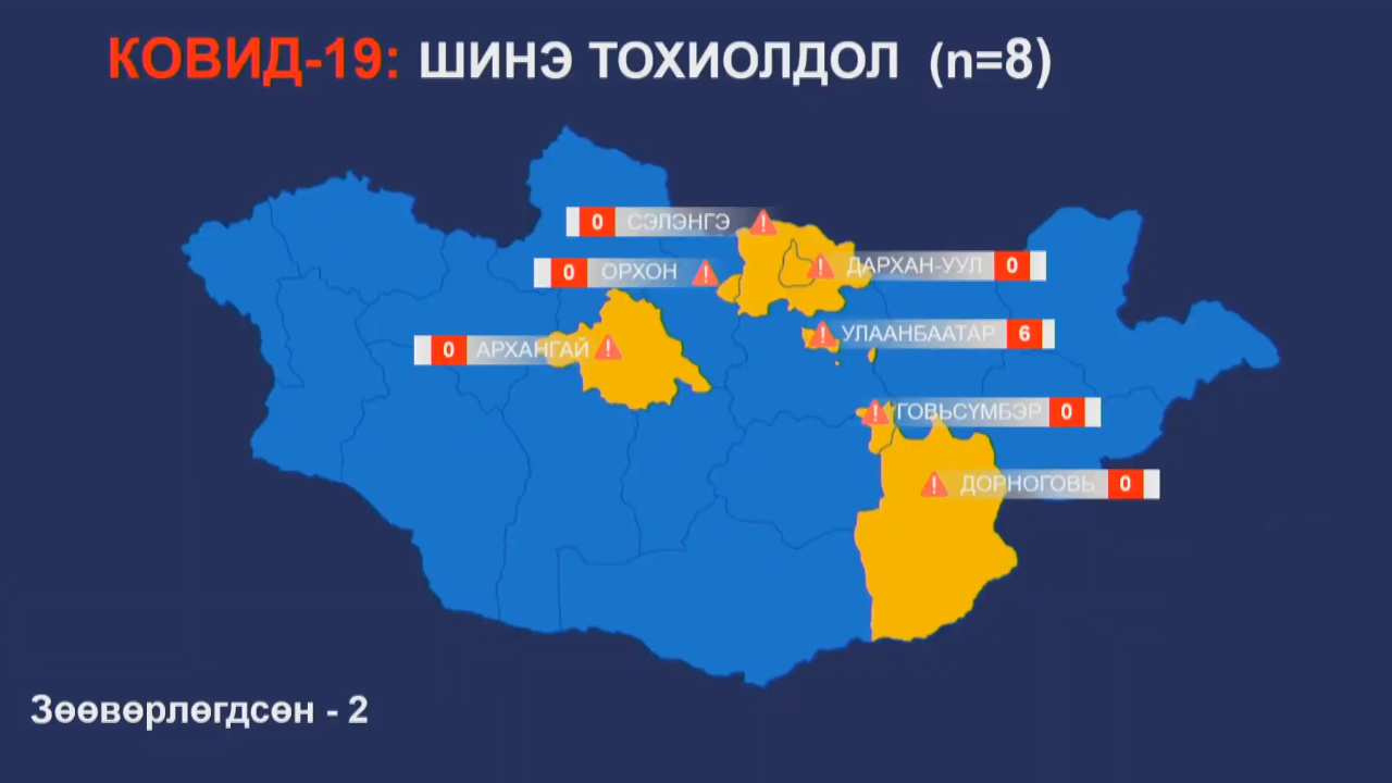 ХӨСҮТ-ийн Тандалт, судалгааны албаны дарга А.Амбасэлмаа "Өнөөдөр нэмэгдсэн найман тохиолдлын зургаа нь Баянзүрх дүүргийн эмнэлгээс илэрсэн. Хоёр нь Герман, Унгараас тусгай үүргийн нислэгээс ирсэн хүмүүсээс илэрсэн. Бид тусгай үүргийн онгоцоор ирж байгаа иргэдээс 24-48 цагийн дотор шинжилгээ авч байгаа. Тийм учраас эдгээр хүмүүсийг гадаадын улс оронд байхдаа халдвар авсан байна гэж үзнэ. Улаанбаатар хотод том том голомтолсон халдвар бүртгэгдэж байна. Иргэдийн дунд шинж тэмдэггүй буюу хөнгөн балархай хэлбэрээр өвчилсөн хүн байх эрсдэл өндөр байна. Энэ цаг үед гаднаас халдвартай хүмүүсийг зөөвөрлөх нь эрсдлийг нэмэгдүүлж байна. Халдвартай хүний тоо хэдий олон болно, төдий чиний иргэдийн дунд халдвар авах магадлал нэмэгдэнэ. Дотоодын голомтыг хязгаарлаж, цомхотгож байгаа цаг үед гаднаас халдвар нэмэгдэж ирвэл мэргэжлийн байгууллагуудад хүнд тусна. Үүнийг цааш цаашдаа анхаарах байх" гэлээ.