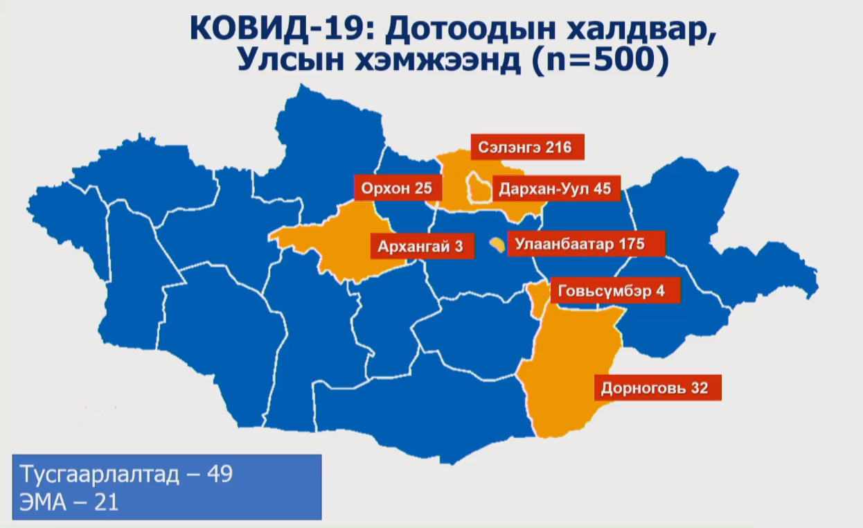Өнөөдрийн байдлаар Монгол Улсын хувьд дотоодын халдварын тоо 500 хүрч, зөөвөрлөгдсөн 461, нийт бүртгэгдсэн халдварын тохиолдол 961 боллоо.