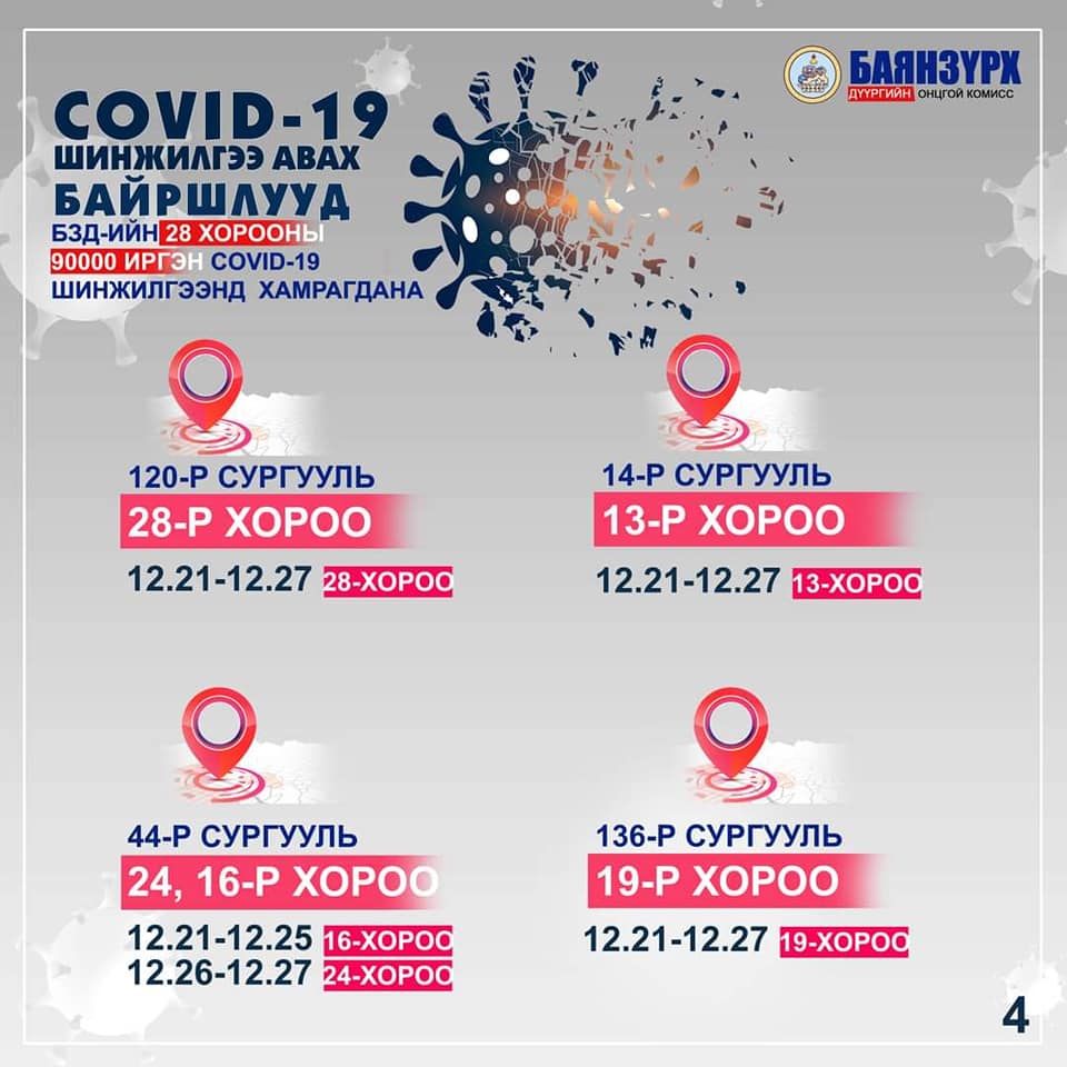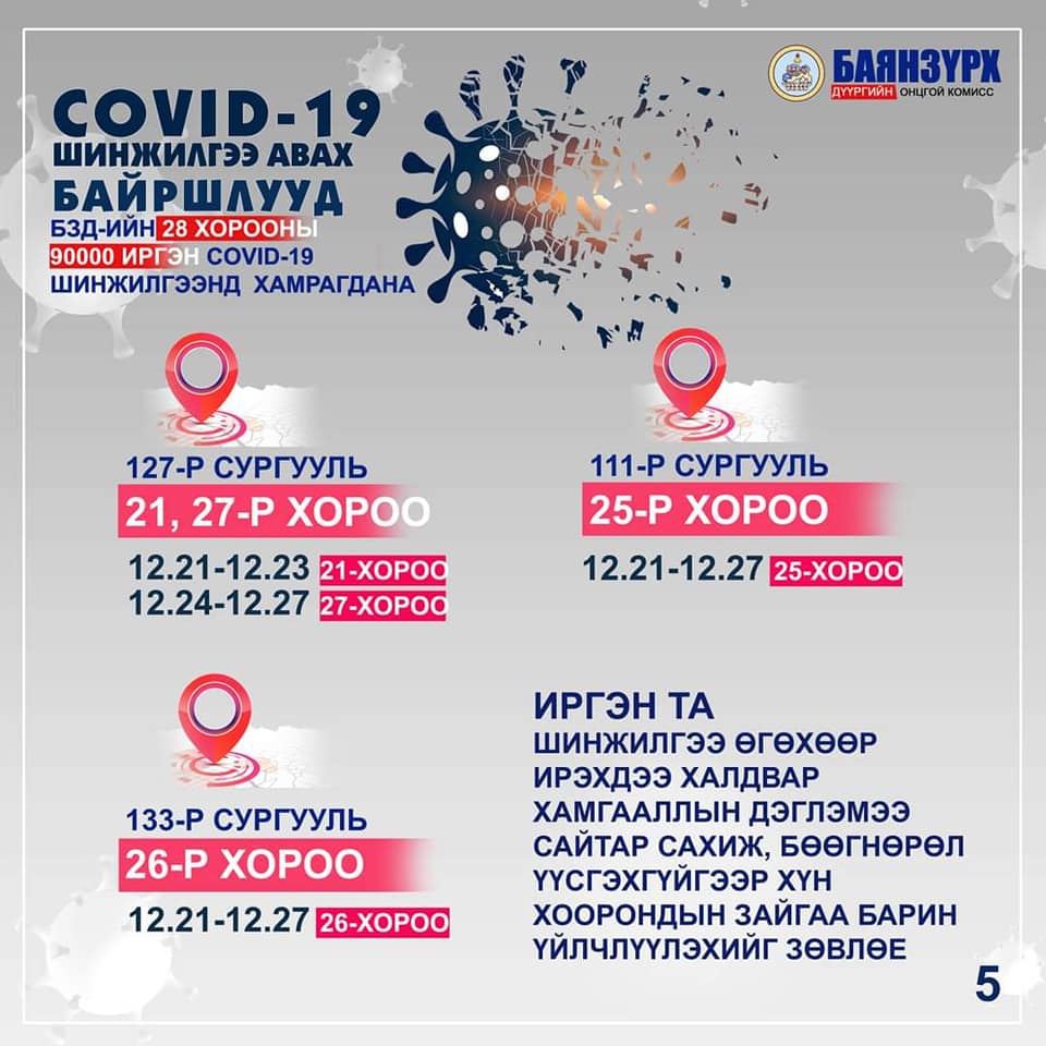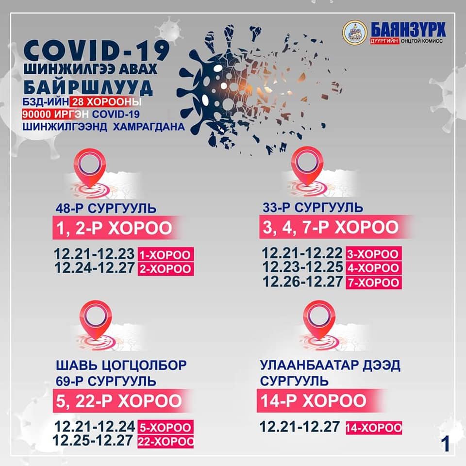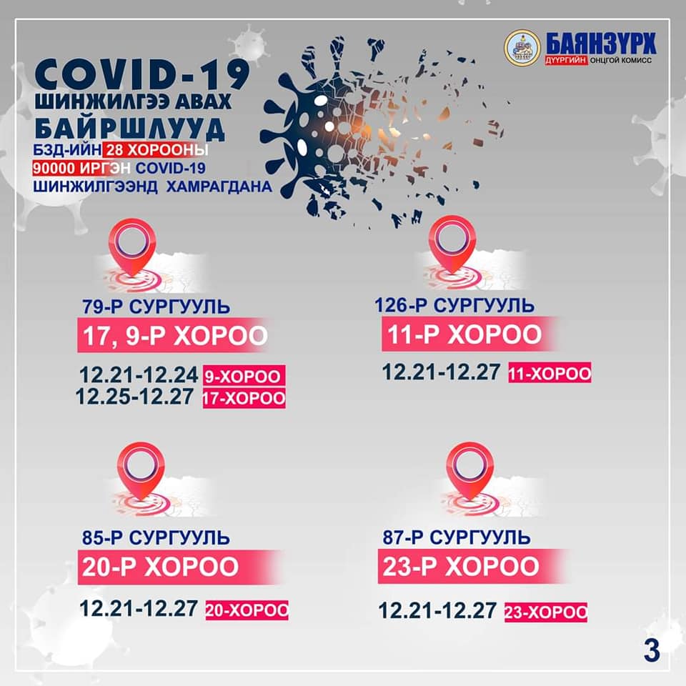 Баянзүрх дүүрэгт үүссэн нөхцөл байдалтай холбоотойгоор өнөөдөр буюу арванхоёрдугаар сарын 21-ний өдрөөс 28-ны өдрийн хооронд 70,000 – 80,000 иргэнийг ПГУ /PCR/-ын шинжилгээнд хамруулж, тандалт хийхээр Улсын онцгой комиссоос шийдвэрлэсэн.