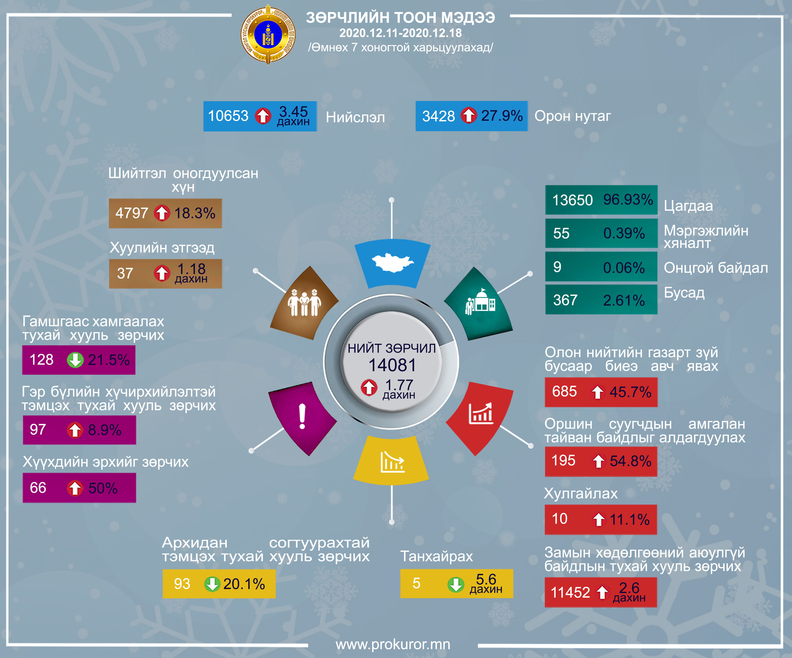 Энэ оны арванхоёрдугаар сарын 11-ний өдрөөс арванхоёрдугаар сарын 18-ны өдөр хүртэлх хугацаанд улсын хэмжээнд гарсан зөрчлийн тоон мэдээг өмнөх долоо хоногтой ЭНД харьцуулахад нийт 14081 зөрчлийн хэрэг бүртгэгдэж 1,77 дахин өссөн бол Нийслэлд 3,45 дахин, орон нутагт 27,9 хувиар тус тус өссөн дүнтэй байна. Зөрчлийн хэргийг шалгасан субъектээр нь ангилж үзвэл цагдаагийн байгууллага 96,93 хувийг, мэргэжлийн хяналт 0,39 хувийг, онцгой байдал 0,06 хувийг, бусад байгууллагын эрх бүхий албан тушаалтнууд 2,61 хувийг нь шалган шийдвэрлэжээ.