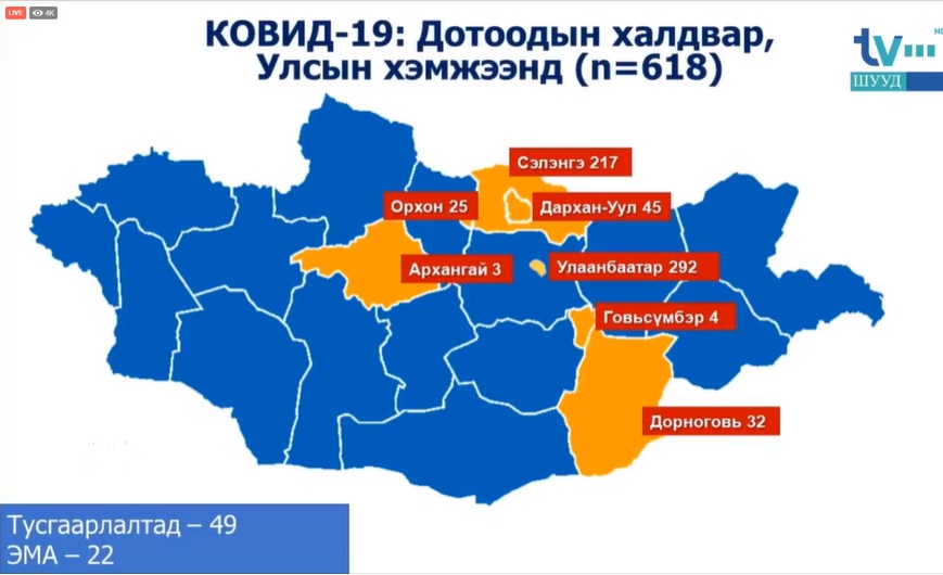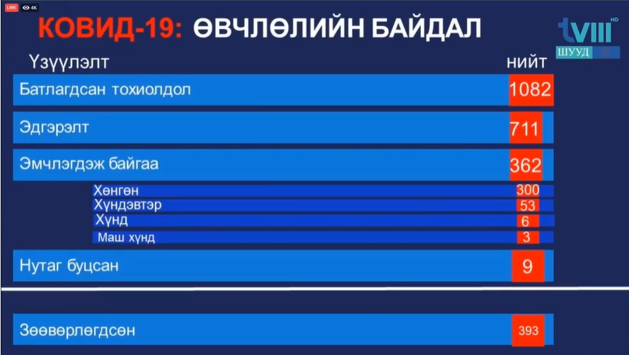 Улаанбаатар хотод өмнө нь бүртгэгдсэн голомтуудаас өвчлөл бүртгэгдээгүй, өнөөдөр 15 дахь хоног нь болж байна. Өмнөх голомтын ойрын хавьтлын гэж тусгаарлагдсан хүмүүсийг хоног хугацаагаар нь ажиглалтаас гаргаад, үлдсэн 250 хүнийг өнөөдрөөс тусгаарлалтаас гаргаж байна.