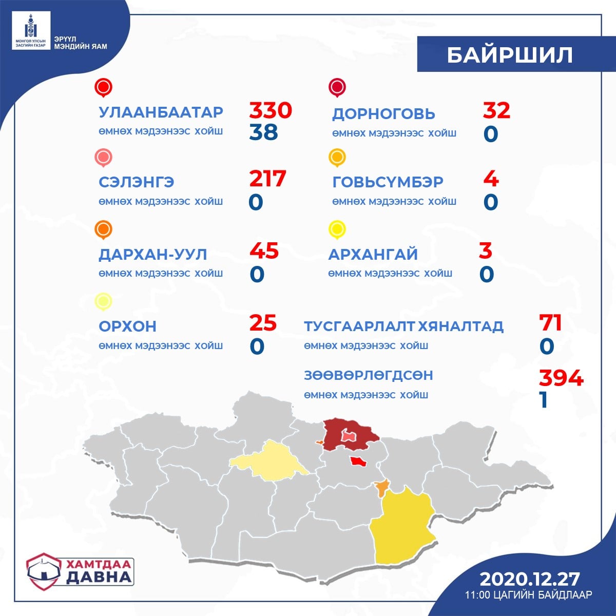 Харин Монгол Улсын хэмжээнд коронавируст "Ковид-19" халдварын нийт батлагдсан тохиолдол 1121 болж байна. Нийслэл хот болон зургаан аймагт голомтлон гарсан халдварын тохиолдол 656, гаднаас зөөвөрлөгдөн ирсэн тохиолдол 394 байна.