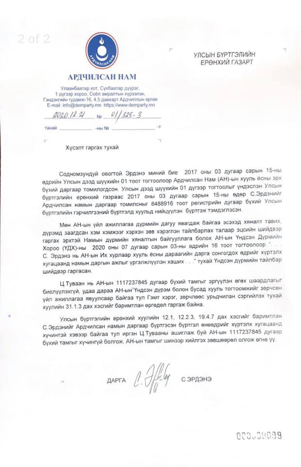 Тэгвэл тус намын 10 дугаар Их хурал өнгөрсөн долоо хоногт цахимаар болсон. Энэ хурлаар тэд намынхаа үндсэн дүрэмд өөрчлөлт оруулж, намын даргад тавих шаардлага, шалгуураа тодорхой болгосон юм. Улмаар дүрмийн өөрчлөлтөө бүртгүүлэхээр Улсын Дээд шүүхэд материалаа хүргүүлээд байсан. Харамсалтай нь, Улсын Дээд шүүхэд хүргүүлсэн тус намын материал албан ёсных биш гэдгийг АН-ыг удирдаж байсан С.Эрдэнэ тодотгожээ. Тэрбээр Улсын Дээд шүүхэд албан хүсэлт хүргүүлж, АН-ын 10 дугаар Их хурлын тэмдэглэл болон материалыг баталгаажуулсан тамга нь хуурамч, хууль ёсных биш хэмээн онцолсон нь олон нийтийн анхаарлын төвд ороод байна.