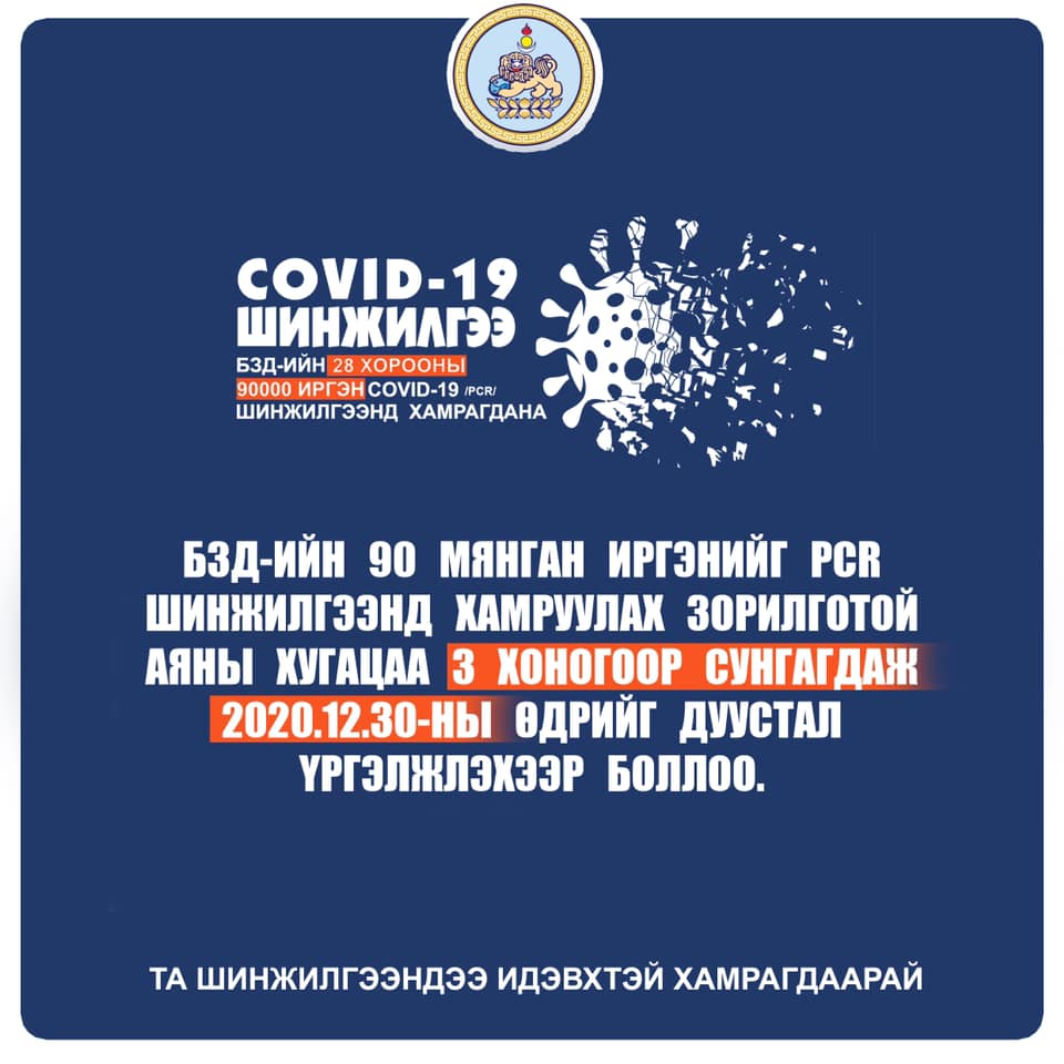Баянзүрх дүүрэгт 19 цэгт нийт 43769 иргэнээс шинжилгээ авахад бүгд сөрөг гарчээ. Тус дүүргийн иргэдээс коровавирусний шинжилгээ авах ажил 19 цэгт үргэлжилж байгаа. Шинжилгээ авах хугацаа арванхоёрдугаарс сарын 30-нд дуусна.