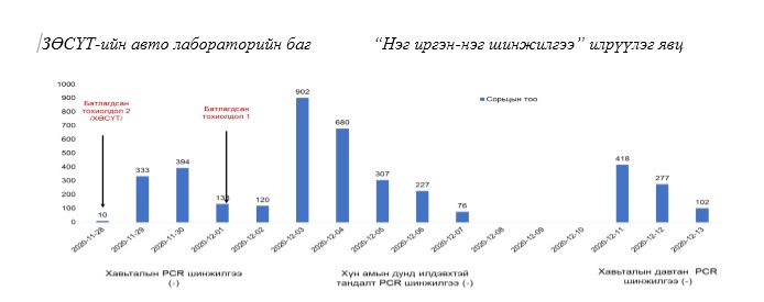 Халдварын батлагдсан тохиолдолын голомтыг өргөтгөн Батцэнгэл сумын хүн амын дунд халдварын тархалтыг тогтоох зорилгоор “Нэг иргэн-нэг шинжилгээ” идэвхитэй илрүүлэг 2020 оны 12-р сарын 02-ноос 12-р сарын 07-ны өдрүүдэд зохион байгуулж, сумын эрүүл мэндийн төвүүд, Нэгдсэн эмнэлэг, өрхийн эрүүл мэндийн төвүүдийн 10 лаборант, лабораторийн эмч ажилласан. ЭМЯ-аас ЗӨСҮТ-ийн явуулын лабораторийг Батцэнгэл суманд ажиллуулан, нийт 3148 хүнийг PCR шинжилгээнд хамруулснаас эерэг гарсан тохиолдол байхгүй байжээ.