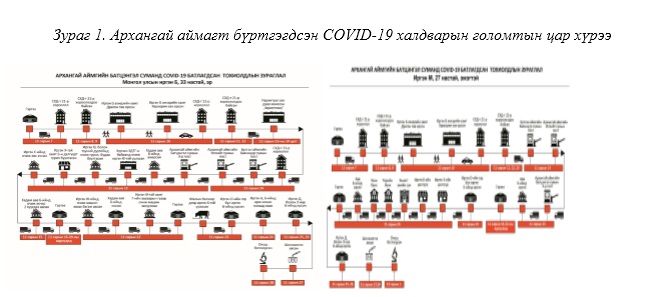 Архангай аймагт коронавируст халдварын батлагдсан тохиолдлын ойрын хавьтал ирсэн тухай мэдээлэл 2020 оны 11 сарын 27-ны өдөр тус аймагт УОК, Тагнуулын хэлтсээс мэдээлэн ЭМЯ, холбогдох талууд мэргэжил арга зүйгээр ханган шуурхай хариу арга хэмжээ хэрэгжүүлсэн. Тус аймгийн Шуурхай хариу арга хэмжээний мэргэжлийн багийг 7 хүний бүрэлдэхүүнтэй 30 минутын дотор томилон гаргаж, тус суманд 2 цагийн дотор тэг зогсолт хийж, хариу арга хэмжээг шуурхай авч, сэжигтэй тохиолдол болон түүний нэн ойрын хавьтал болох 9 хүнээс сорьц авч ХӨСҮТ-ийн лабораторид хүргүүлэн PCR шинжилгээнд хамруулахад 3 тохиолдол онош батлагдаж, тэднийг Цэргийн төв эмнэлэг рүү тээвэрлэж эмчилгээнд хамруулсан.