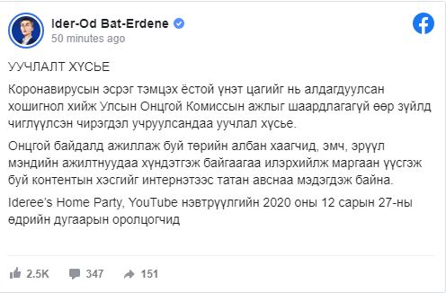 Энэ талаар тус нэвтрүүлгийн хөтлөгч, комедиан Б.Идэр-Од өөрийн фэйсбүүк хуудсандаа "Коронавирусын эсрэг тэмцэх ёстой үнэт цагийг нь алдагдуулсан хошигнол хийж Улсын Онцгой Комиссын ажлыг шаардлагагүй өөр зүйлд чиглүүлсэн чирэгдэл учруулсандаа уучлал хүсье. Онцгой байдалд ажиллаж буй төрийн албан хаагчид, эмч, эрүүл мэндийн ажилтнуудаа хүндэтгэж байгаагаа илэрхийлж маргаан үүсгэж буй контентын хэсгийг интернэтээс татан авснаа мэдэгдэж байна" гэжээ.