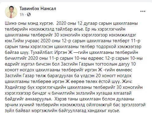 Сануулахад, Олон нийтийн сүлжээнд хүчтэй өрнөж буй энэ шүүмжлэлд Эрчим хүчний сайд Н.Тавинбэх өчигдөр фэйсбүүк хуудсаараа дамжуулан мэдээлэл өгч, "2020 оны 12 дугаар сарын цахилгааны төлбөрийн нэхэмжлэлд тайлбар өгье. Хэрэглэгчийн цахилгааны төлбөрийг 30 хоногийн хэрэглээгээр нэхэмжилдэг. Тийм учраас 2020 оны 12-р сарын цахилгааны төлбөрт 11-р сарын таны хэрэглэсэн цахилгааны төлбөр тодорхой хэмжээгээр байгаа. Тухайлбал, Иргэн Ж-гийн цахилгааны төлбөрийн бичилтийг 2020 оны 11-р сарын 10-ны өдрөөс 12-р сарын 10-ны өдрийг хүртэл бичсэн бол Засгийн Газрын тогтоолын дагуу 10 хоногт ногдох цахилгааны төлбөрийг иргэн Ж-гийн өмнөөс Засгийн газар төлж барагдуулах ба үлдсэн 20 хоногт ногдох цахилгааны төлбөрөө иргэн Ж өөрөө төлөх ёстой. Хэдийгээр бүх хэрэглэгчдийн цахилгааны төлбөрийг 30 хоногийн хэрэглээгээр бичдэг ч бичилтийн эхлэлийн хугацаа ялгаатай байдгийг анхааруулья. Хэрэв таны цахилгаан болон дулааны эрчим хүчний төлбөрийн нэхэмжлэлд ойлгомжгүй бас эргэлзээтэй зүйл байвал мэргэжлийн байгууллагад хандахыг хүсье" гэсэн тайлбар хүргэсэн билээ.