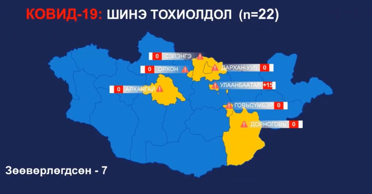 Өнгөрсөн 24 цагийн хугацаанд 11152 хүнд PCR шинжилгээ хийхэд 22 хүнд коронавирус илэрчээ. Тэдний долоо нь Франкфурт - Улаанбаатарын чиглэлийн онгоцоор ирсэн хүмүүс аж. Тэдний гурав дахь давтан шинжилгээнээс коронавирус илэрчээ.