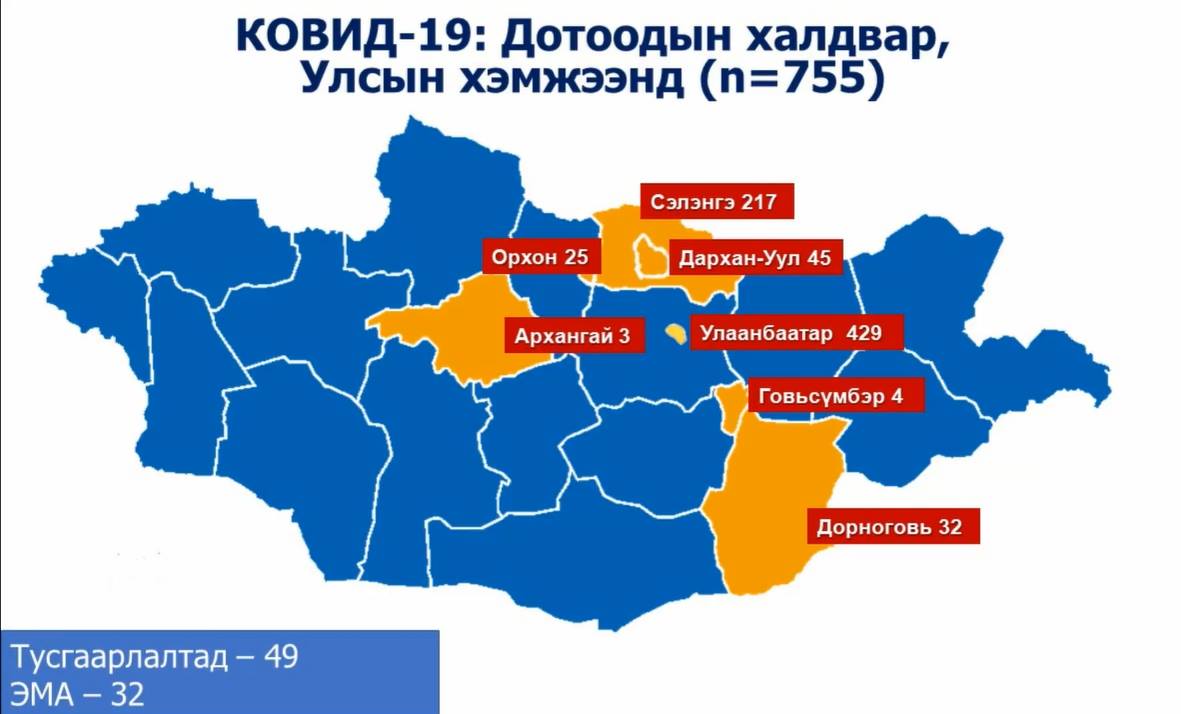 Улсын хэмжээнд кластер өвчлөлийн голомтод 755 тохиолдол бүртгэгдлээ. Сүүлийн 24 цагт 18 хүн эдгэрч, гэртээ гарсан" гэлээ.