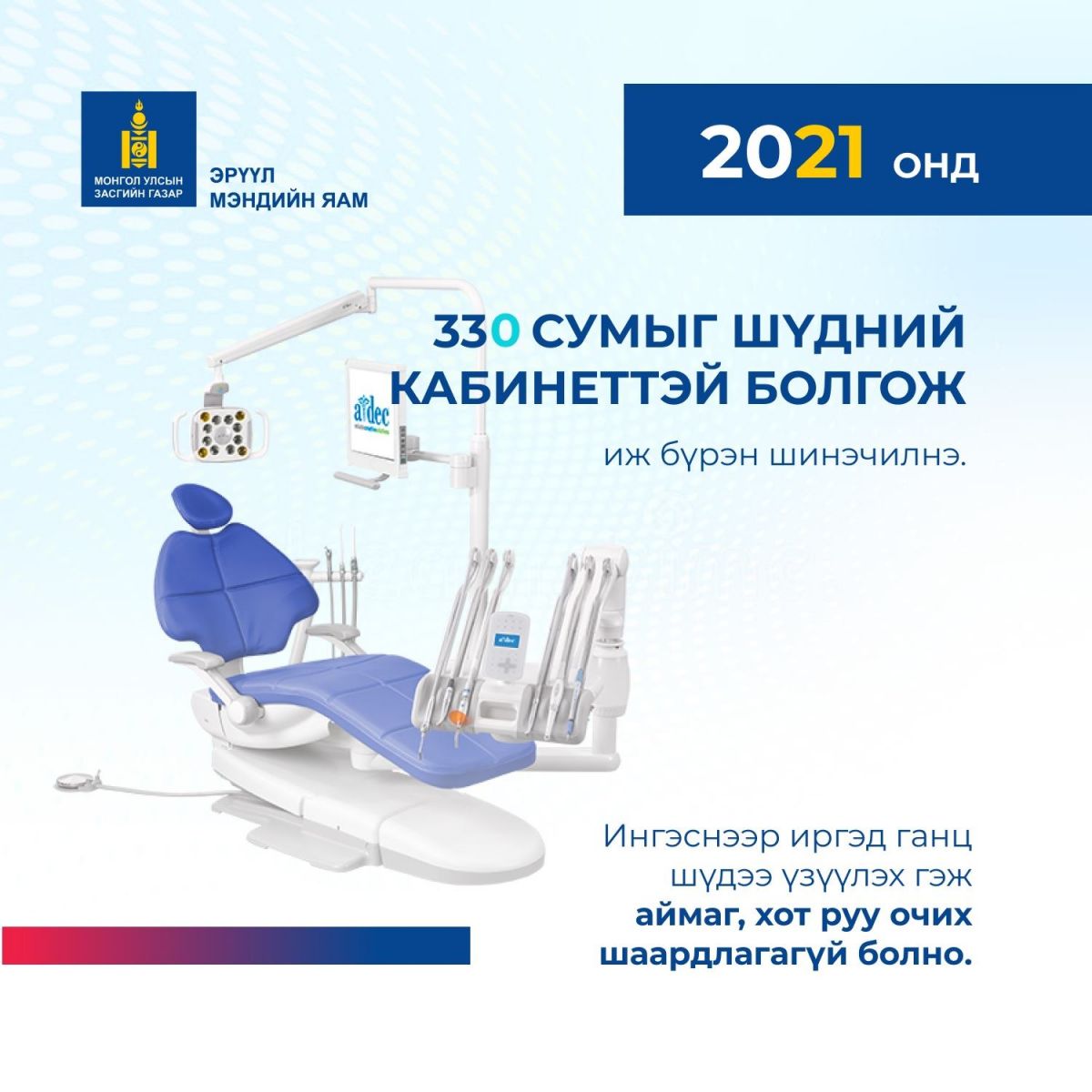2021 онд 330 сумыг шүдний кабинеттай болгох ажлыг хийнэ гэж ЭМЯ-аас мэдээллээ. Хөдөө, орон нутгийн иргэд шүдээ үзүүлэх гэж хэдэн зуун км явж, аймгийн төв орж үзүүлдэг байсан бол оршин суугаа газраасаа шүдний тусламж, үйлчилгээг авдаг болно. Тус кабинетээр дамжуулан эрүүл мэндийн боловсрол, зөв дадлыг олгох ажлууд хийгдэнэ. Шүдний өвчлөл нь хамгийн их ачаалал өндөртэй тусламж, үйлчилгээнүүдийн нэг юм.