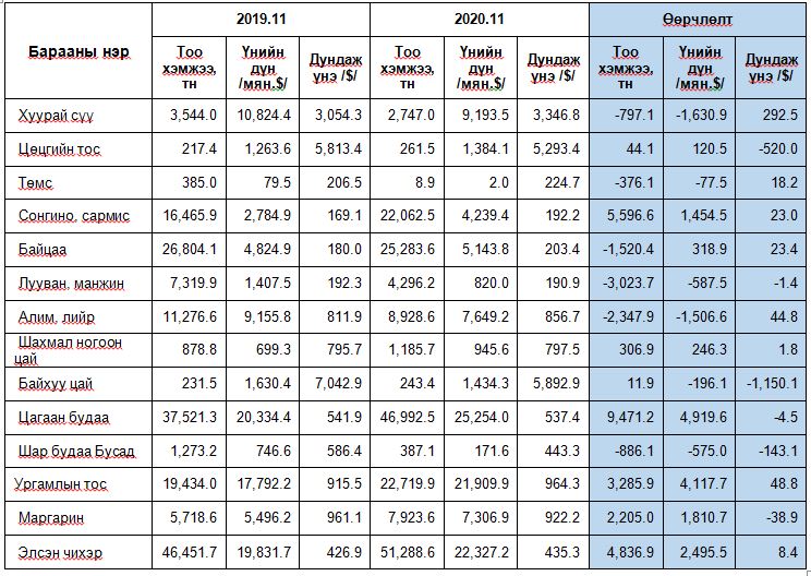 2020 оны арваннэгдүгээр сарын байдлаар хүнсний гол нэрийн дараах бүтээгдэхүүнүүдийн импорт үнийн дүнгээр өсжээ.