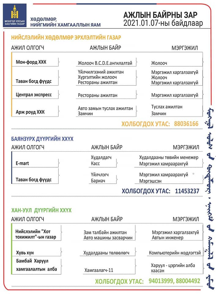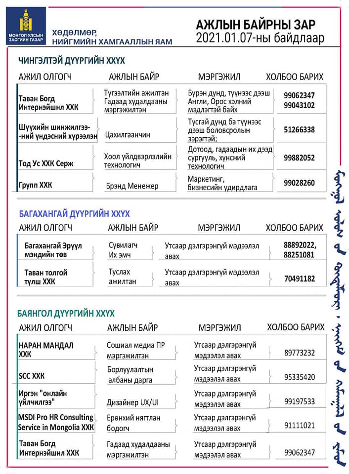 2021.01.07-ны байдлаар Нийслэлийн хэмжээнд дараах ажлын байруудыг шинээр зарлажээ.