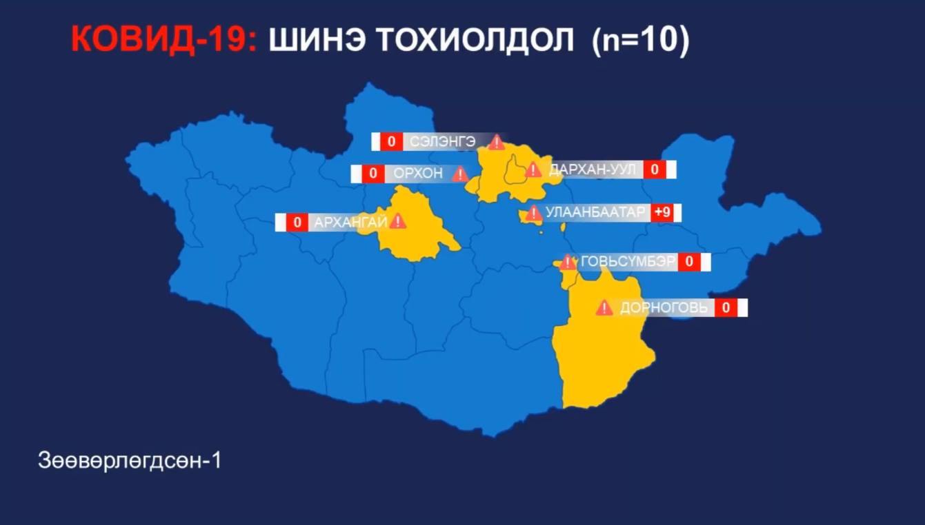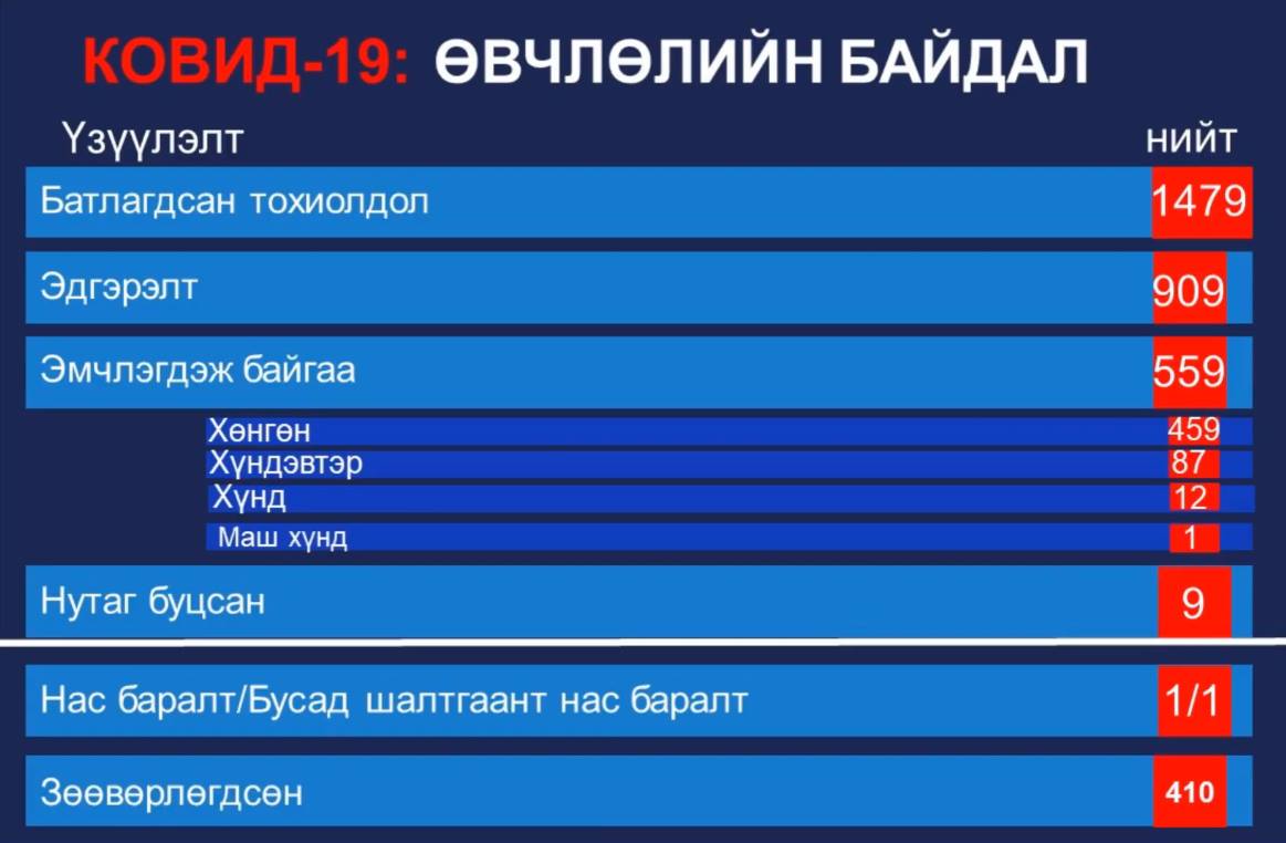 Өнгөрсөн 24 цагийн хугацаанд 15899 хүнд шинжилгээ хийжээ. Шинээр бүртгэгдсэн 10 тохиолдлын ес нь Улаанбаатарт бүртгэгдсэн байна. Эдгээрийн долоо нь БЗД-ийн 17-р хорооны өмнө нь батлагдсан тохиолдлын гэр бүлийн хүмүүс, хоёр нь "Ачтан" эмнэлгийн батлагдсан тохиолдлын хавьтал байжээ. Зөөвөрлөгдсөн тохиолдол нэгээр нэмэгдсэн нь Афганистанаас ирсэн энхийг сахиулагч бөгөөд зөөвөрлөгдсөн тохиолдлын тоо өнөөдрийн байдлаар 410 хүрчээ.