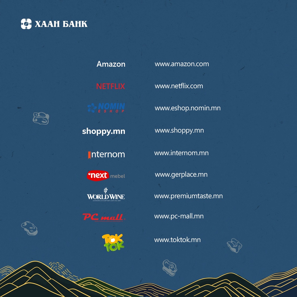 *Та дотоодын вэбсайтуудаас худалдан авалт хийхдээ төлбөр төлөх банкаар ХААН Банкийг сонгож төлснөөр буцаан олголт авах боломжтой. Интернэт банк, мобайл банк, qpay үйлчилгээг ашиглан төлсөн худалдан авалтад тус урамшуулал үйлчлэхгүйг анхаарна уу.