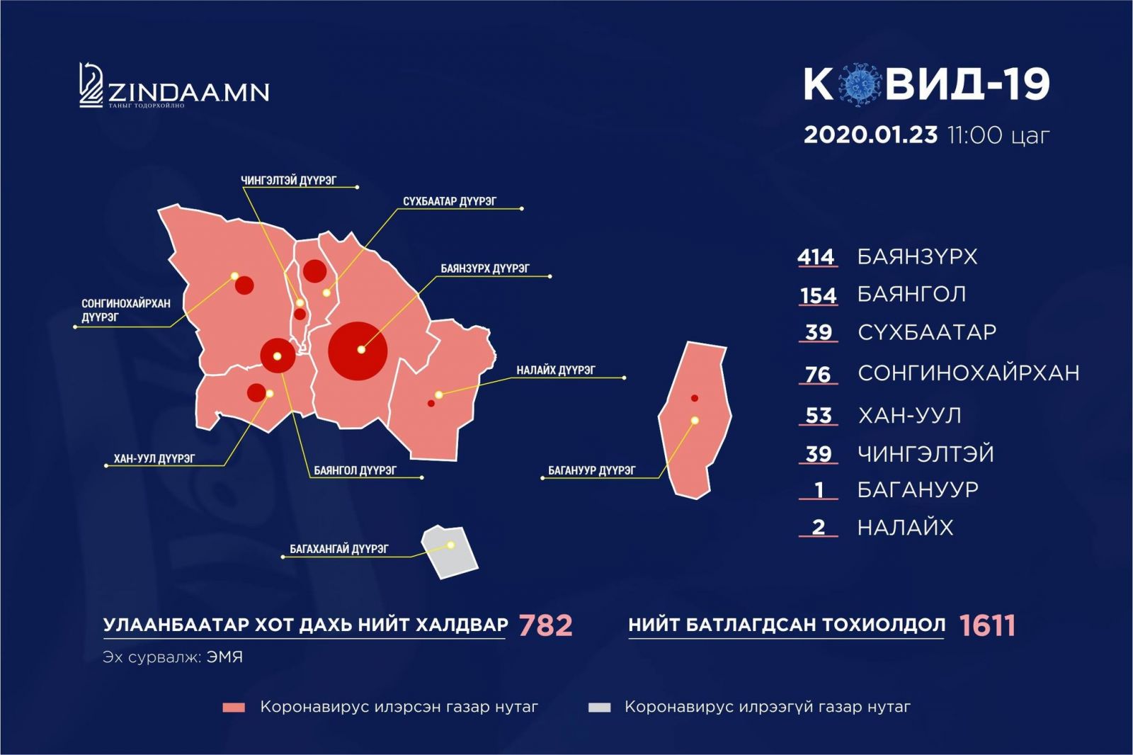 Өнгөрсөн 24 цагийн хугацаанд вирус судлалын лабораториудад 15.071 хүнд PCR шинжилгээ хийхэд 19 хүнд коронавирус илэрлээ. Эдгээр нь Улаанбаатар хотод бүртгэгдлээ. Бүгд өмнөх батлагдсан тохиолдлуудын хавьтал байна. "Монос"-той холбоотой 5, Хас банктай холбоотой 1, ЧД, СХД, БЗД-ийн гэр бүлийн хавьтал болсон хүмүүст коронавирус илэрсэн байна.Ингээд Улаанбаатар хотын батлагдсан тохиолдол 782 боллоо. 24 цагийн хугацаанд бусад аймгуудад халдвар бүртгэгдээгүй. Улсын хэмжээнд нийт кластер өвчлөлийн голомтод 1108 тохиолдол байна.