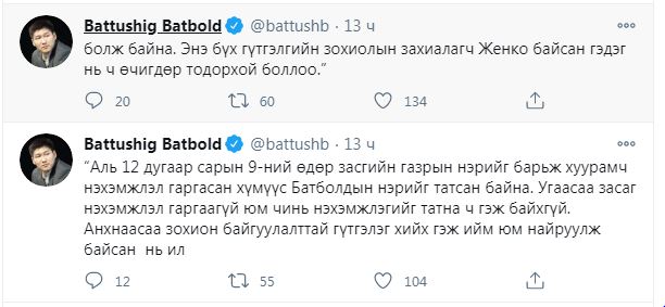 Харин УИХ-ын гишүүн С.Батболд “Энэ бүхэн гүтгэлэг, гүтгэлэгийг удаан тэвчиж өнөөдрийг хүрлээ” гэсэн байр суурийг илэрхийлж байгаа.