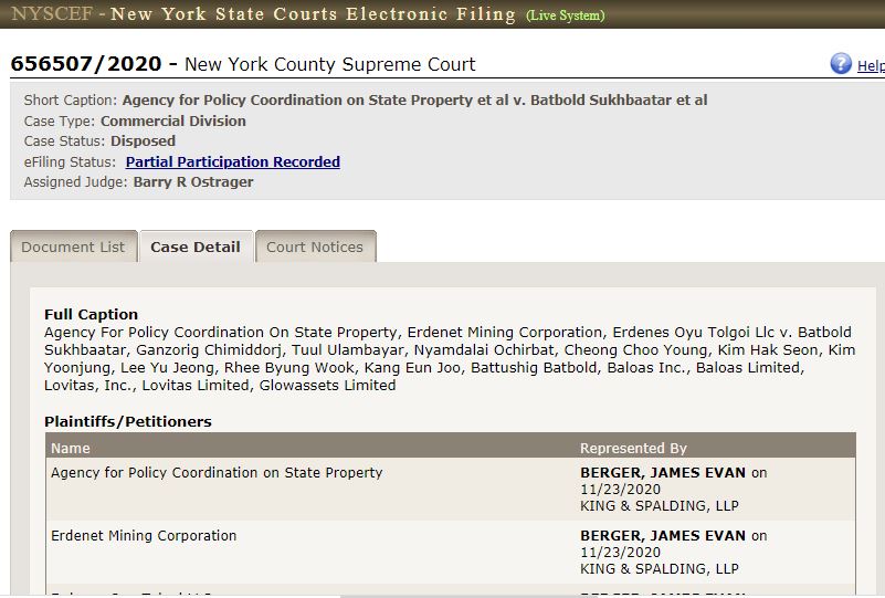 Нью-Йоркийн шүүхийн цахим хуудас дахь мэдээллээс үзэхэд Сүхбаатарын Батболд гишүүн, Төрийн өмчийн бодлого зохицуулалтын газартай холбоотой гэх нэхэмжлэл цуцлагдсан гэдэг нь бол харагдаж байна.