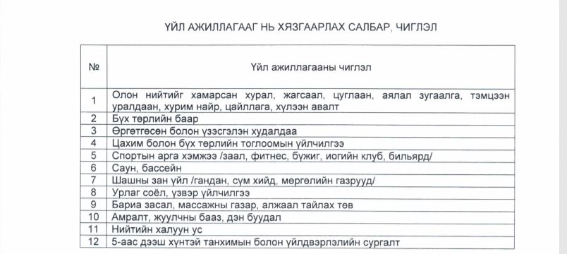Өнгөрсөн хугацаанд Бүх нийтийн бэлэн байдлын зэргийг бууруулж өндөржүүлсэн бэлэн байдалд шилжсэнтэй холбоотойгоор хязгаарлагдсан 18 чиглэлийн үйл ажиллагаа байсныг үе шаттайгаар нээж байна. Цаана нь 12 чиглэлийн үйл ажиллагаа хязгаарлагдсан хэвээр үлдэж байна. Эдгээр байгууллагууд мэргэжлийн байгууллагуудын эрсдэлийн үнэлгээгээр коронавирус тархах хамгийн өндөр эрсдэлтэй гэж ойлгож болно.