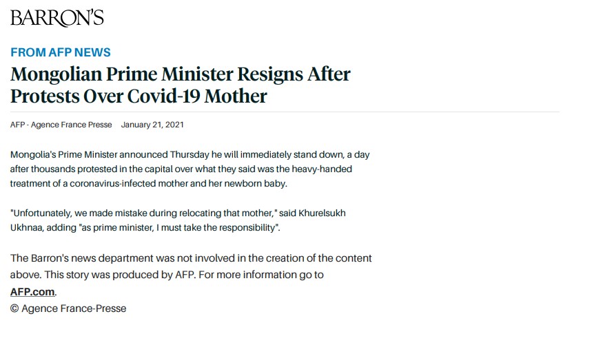 Монгол Улсад коронавирустэй дөнгөж төрсөн эхийг, нярайн хамт өөр эмнэлэг рүү шилжүүлэх тээвэрлэлтийн үеэр хүний эрхийг ноцтой зөрчсөн үйлдэл болж, улмаар эсэргүүцлийн жагсаал өрнөж, Монгол Улсын Ерөнхий сайд огцорлоо.