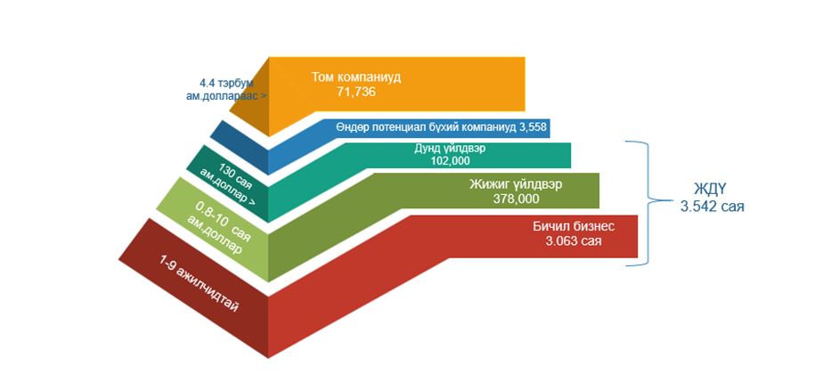 Хятад, Япон, БНСУ-ын аж ахуйн нэгжүүдийн 90 гаруй хувь нь ЖДҮ эрхлэгчид байдаг бол манай тухайд 77 хувь гэх тоо бий. 2019 онд батлагдсан Жижиг, дунд үйлдвэр, үйлчилгээг дэмжих тухай хуулийн хэрэгжилтийн хүрээнд энэ үзүүлэлт 90 гаруй хувь руу буюу олон улсын жишиг рүү очно гэсэн хүлээлт байгаа юм.