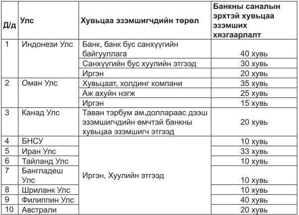 ОЛОН УЛСАД АРИЛЖААНЫ БАНКНЫ ХУВЬ ЭЗЭМШЛИЙН ТОГТООСОН БАЙДАЛ