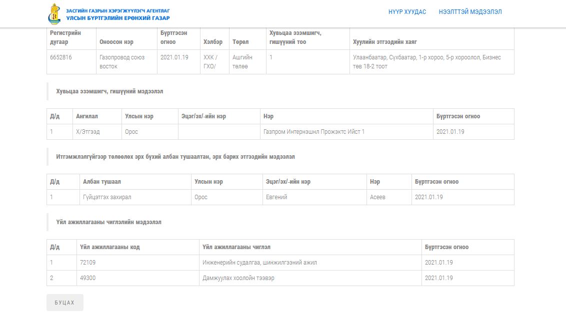 Тэгвэл “Газопровод союз восток” компанийн мэдээллийг Улсын Бүртгэлийн Ерөнхий Газрын цахим хуудаснаас орж үзэхэд 2021 оны нэгдүгээр сарын 19-нд албан ёсоор бүртгүүлжээ. Нэг хувьцаа эзэмшигчтэй, ашгийн төлөө байгууллага гэж бүртгүүлсэн байна.
