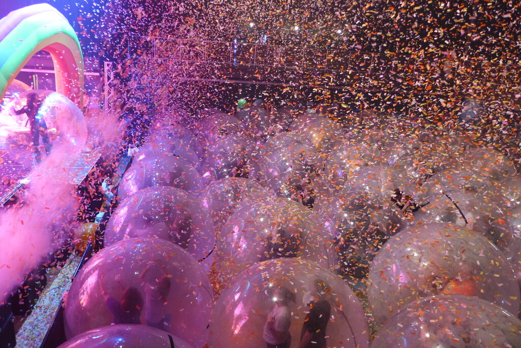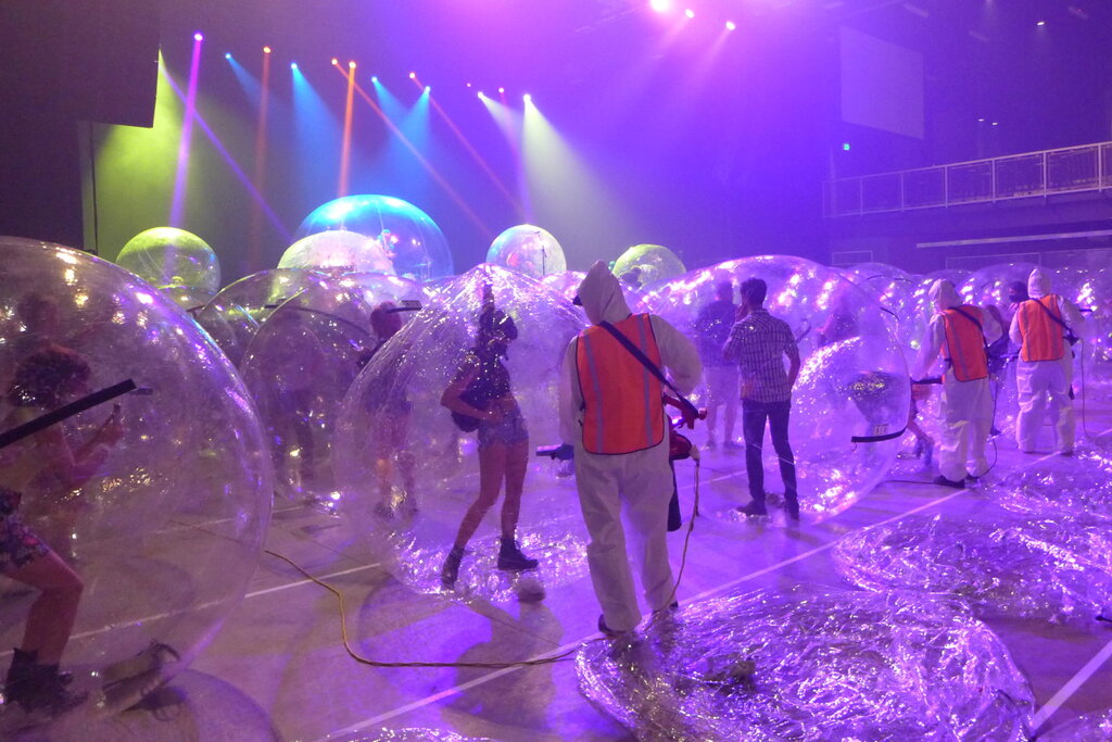 00-д орох үзэгчийг бөмбөлөгтэй нь өнхөрүүлэн тусгай бүст аваачиж, тэндээс нь гаргаж байсан бол бүгчимдсэн тохиолдолд сэрүүн агаар бөмбөлөгт шахаж байжээ.