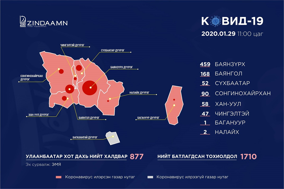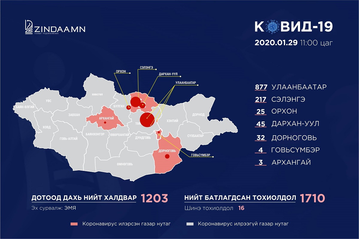 Монгол Улсын хэмжээнд коронавирусний батлагдсан тохиолдол 1710, үүнээс эдгэрдсэн 1303 буюу 76,2 хувийг эмчлэн эдгэрүүлсэн байна. Одоогоор 394 хүн эмчлэгдэж байна. Үүнээс хүнд 1, хүндэвтэр 50, хөнгөн 343 хүн эмчлэгдэж байна.