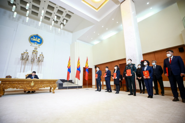 Ингээд сайд нар Есөн хөлт цагаан тугийн танхимд Ерөнхий сайдаас батламжаа гардан авч байна.