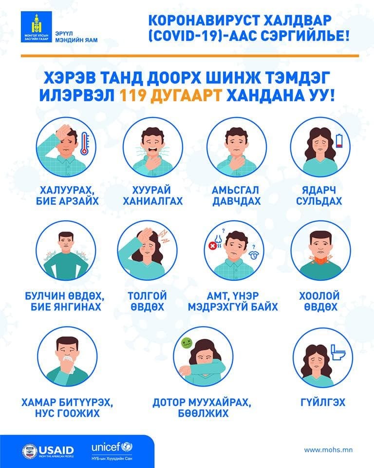 Ковид-19!!! Хэрэв танд доорх шинж тэмдэг илэрвэл 119 дугаарт хандана уу!