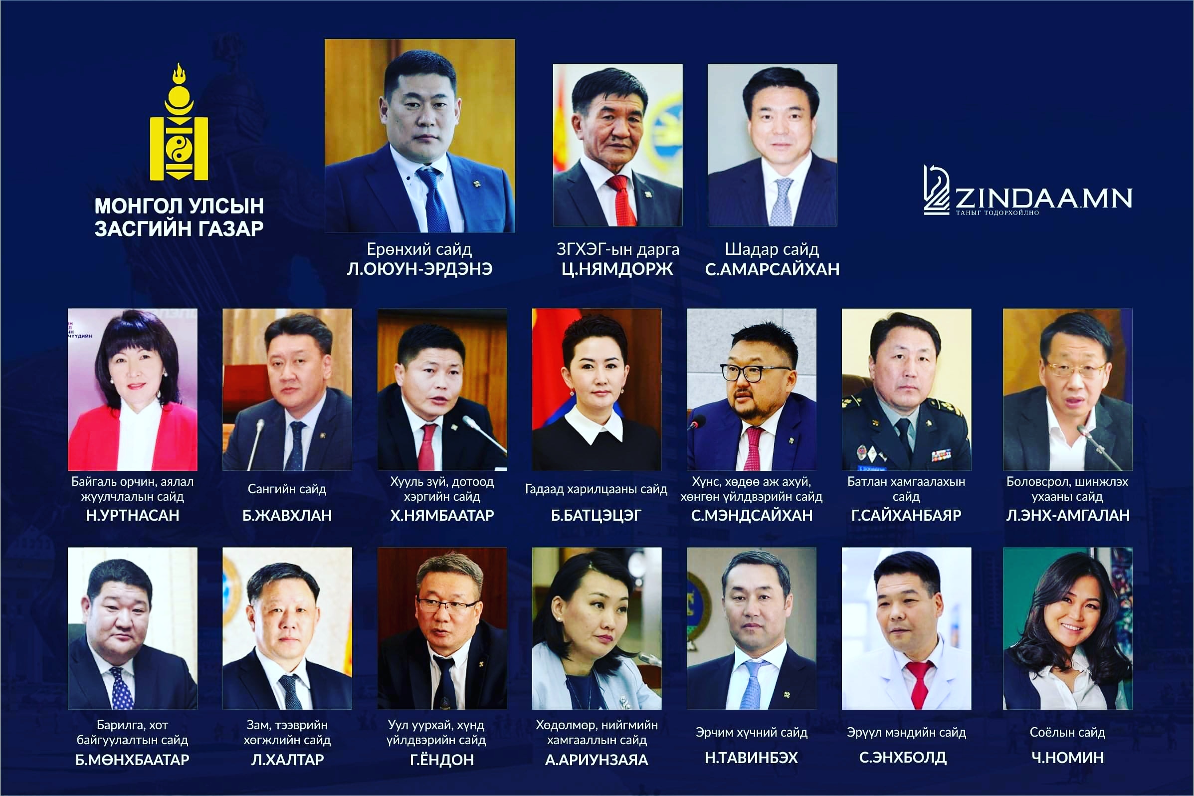 Ерөнхий сайд Л.Оюун-Эрдэнэ нэгдүгээр сарын 29-ний өдөр захирамж гаргаж Засгийн газрын гишүүдээ томилсон. Энэ удаагийн Засгийн газрын 50 хувь нь У.Хүрэлсүхийн тэргүүлж байсан Засгийн газрын гишүүд улиран ажиллахаар боллоо. Үүнд ХЗДХ-ийн сайд Х.Нямбаатар, БХ-ын сайд Г.Сайханбаяр, ХНХ-ын сайд А.Ариунзаяа, БХБ-ын сайд Б.Мөнхбаатар, ЗТХ-ийн сайд Л.Халтар, УУХҮ-ийн сайд Г.Ёндон, ХХААХҮ-ийн сайд З.Мэндсайхан, ЭХ-ний сайд Н.Тавинбэх нар багтаж байна.