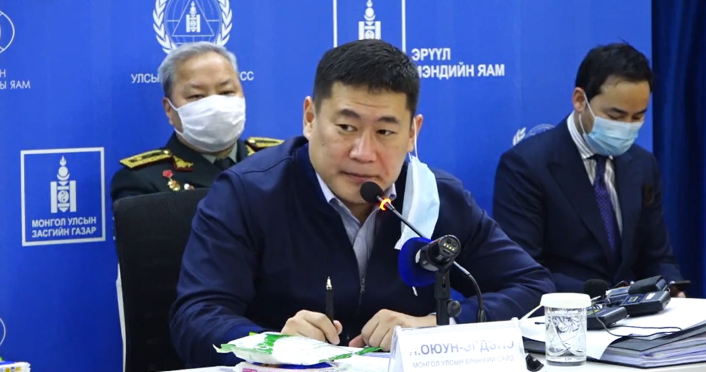 Энэ үеэр Ерөнхий сайд Л.Оюун-Эрдэнэ "Бид маш хүнд нөхцөлд ажиллаж байна. Өнгөрсөн хугацаандаа бид дүгнэлт хийх ёстой. Та бүхнийг магтах гэж ирээгүй. Цар тахал бол цогц асуудал болохоор шийдэл нь цогц байх ёстой. ОБЕГ болон эрүүл мэндийн байгууллагын уялдаа холбоо тааруу байж ирсэн. Нэгдүгээрт, вакцин оруулж ирнэ. Энд бэлэн үү, төлөвлөгөө байна уу. Сая газар хөдлөлт боллоо, яагаад Засгийн газарт мэдэгдсэнгүй вэ. Хүчний байгууллага нь мэдээлэлгүй байсан шүү. Бид цар тахлыг хөөх биш урьдчилан сэргийлж, угтсан арга хэмжээ авах хэрэгтэй. Дэлхийн олон улсад амжилттай яваа арга хэмжээнүүд байна. Цар тахлыг хэрхэн богино хугацаанд давах туулах вэ, эдийн засагтай нь цогцоор нь харж, төлөвлө. Лхагва гарагт болох Засгийн газрын хуралдаанд танилцуулах хэрэгтэй байна. Хамтарч ярилцах хэрэгтэй, өдөр шөнөгүй ажиллаж, ярилцах хэрэгтэй. Үйл ажиллагаа чинь салангад байж болохгүй. Засгийн газар болон УОК-оос гаргасан шийдвэр замдаа замхарч байна. Ийм байж болохгүй. Одоогийн хадлагаа өөрчлөхгүй бол би хариуцлага тооцож ажиллах болно" хэмээн тодотголоо.