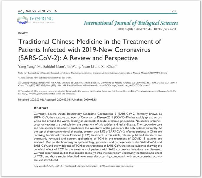 -БНХАУ-ын судлаачдын уламжлалт анагаах ухааны эмийн жороор Ковид-19 өвчнийг эмчилсэн эмнэлзүйн судалгааны үр дүн 2020 оны 4 сард олон улсад хэвлэгдсэн. Тус улсын 26 мужид уг вирусийн халдвараар өвчилсөн өвчтөнүүдэд уламжлалт жор болон жорд орсон гол эмийн ургамлыг сонгон эмчлэхэд дунд болон хөнгөн өвчтэй хүнд эмчилгээний үр дүн сайн байгааг тогтоосон.