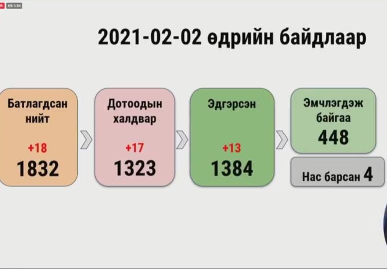 Энэ үеэр ХӨСҮТ-ийн дэд захирлын үүрэг гүйцэтгэгч Э.Тэмүүлэн "Өнгөрсөн хоногт 18 хүнээс халдвар нэмж илэрлээ. Тэдний 17 нь дотоодын халдвар байна. Харин нэг иргэн тусгай үүргийн онгоцоор ирсэн. Тэгвэл 17 тохиолдлын нэг нь эмнэлгийн ажилтан байна. Мөн нийтдээ дөрвөн хүн нас бараад байна" гэх мэдээллийг өглөө.