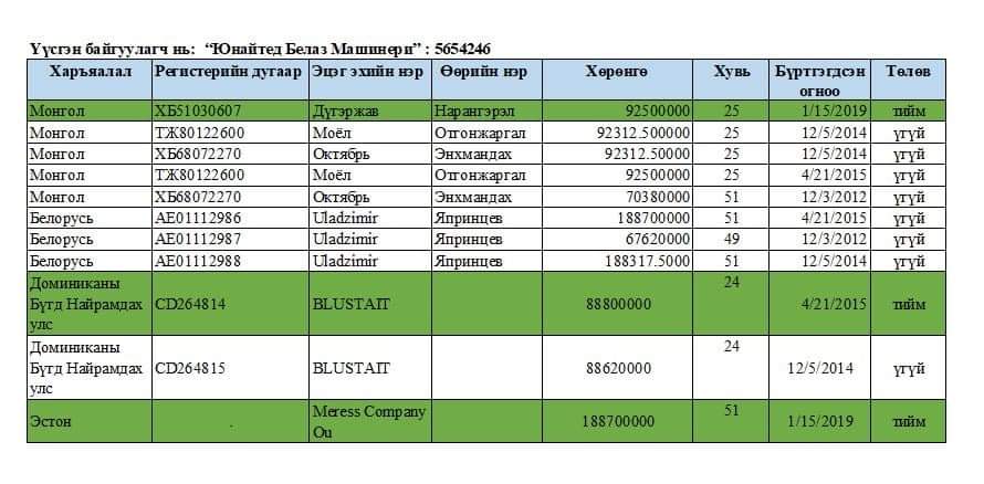 Шалгагдаж эхлэхээс урьтаж тус 2 эрхэм “Юнайтед Белаз Машинери” ХХК-ийн өөрийн эзэмшлийн хувиудаа өөрийн нэр дээрх оффшор бүсэд бүртгэлтэй Эстони улсын Meress Company, Доминиканы Бүгд Найрамдах улсын “Блюстайт”/Blustait Ltd/компани болгон өөрчилж жимийг хазайлгасан аж.